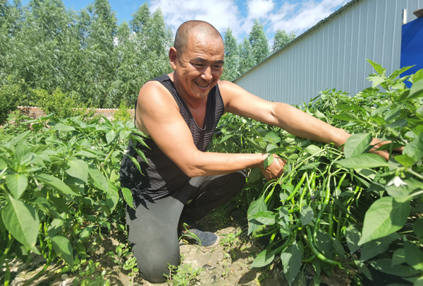 一場(chǎng)陣雨過(guò)后,前復(fù)興屯村民李瑞輝在后院辣椒地忙著鋤草。一壟壟線椒枝繁葉茂,白色的小花掛滿枝頭,成串的辣椒嫩生生、胖乎乎地點(diǎn)綴其間,收獲在望。