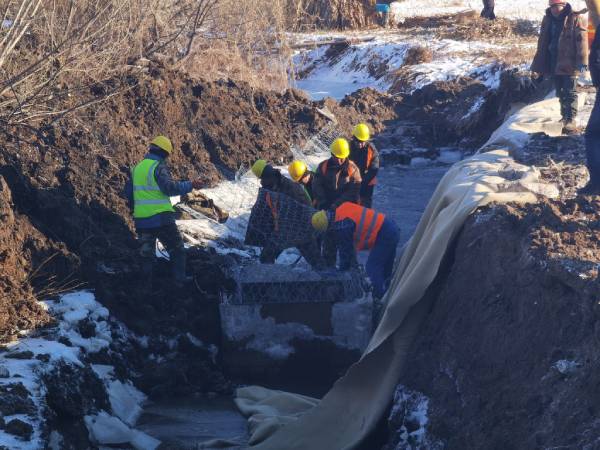11月29日上午,東遼縣室外溫度達到零下13℃,但是高標準農田建設施工正火熱進行。在建安鎮4標段東壁村的施工現場,挖掘機傳出隆隆聲響,工人們在河溝中破冰施工,將裝好的石籠網箱按照要求埋入河底。