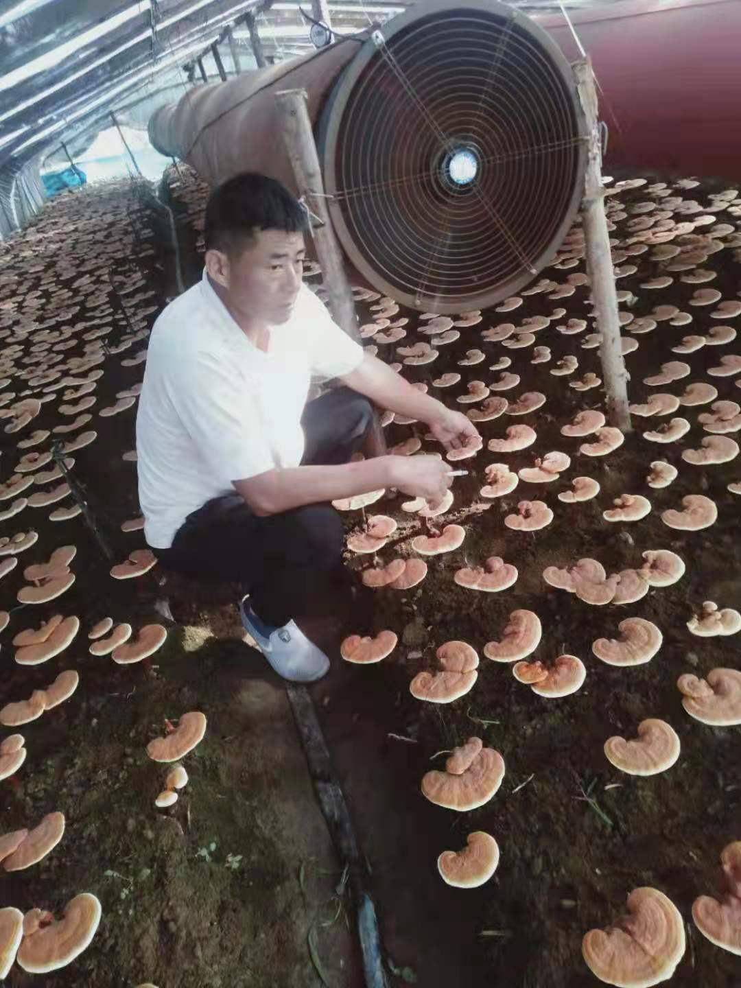 姚在強(qiáng)一邊學(xué)習(xí)一邊實(shí)踐。第二年就在自己的園田地里開始進(jìn)行靈芝栽培試驗(yàn)。由最初的幾十平方米,逐漸擴(kuò)大規(guī)模。剛開始由于技術(shù)不過關(guān),靈芝孢子粉產(chǎn)量比較低。每個(gè)大棚(大約0.3畝)最初只能采收孢子粉30公斤左右。靈芝栽培過程中的菌段培育、接菌發(fā)菌、菌段擺放、溫濕度掌控等關(guān)鍵環(huán)節(jié),姚在強(qiáng)都仔細(xì)研究,從不馬虎。隨著栽培技術(shù)的不斷提高,現(xiàn)在每個(gè)棚能夠采收靈芝孢子粉80公斤以上。
