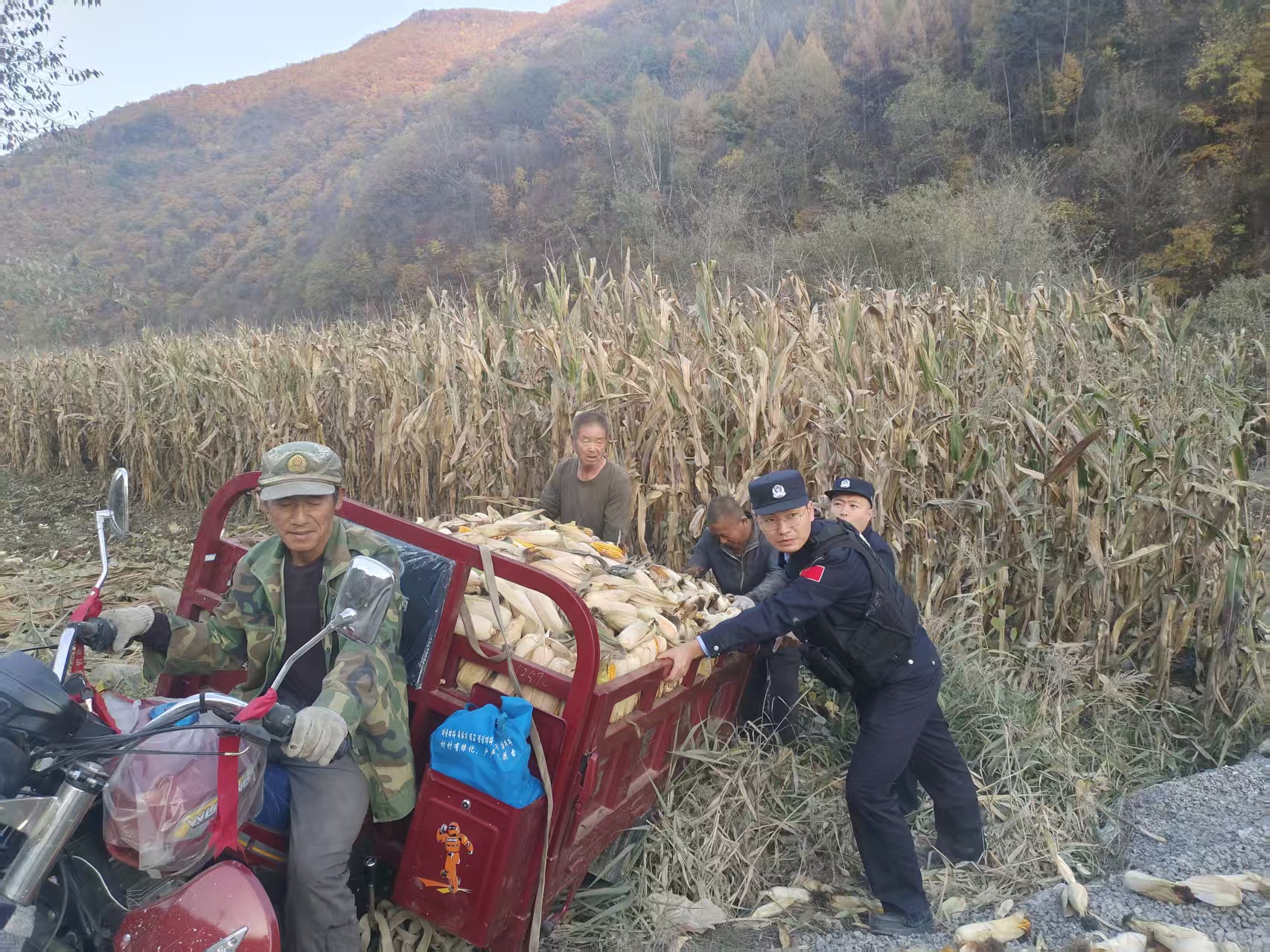 事發當日,十三道溝邊境派出所的民警在順利完成一次出警任務后,驅車返回單位。途中,民警們敏銳地發現前方一輛民用三輪車歪斜在道路旁,車輪深深陷入泥濘的土坑中,無法動彈。駕駛員在一旁焦急萬分,多次嘗試啟動車輛都未能脫困。見狀,民警立即靠邊停車,上前了解情況。經詢問,該駕駛員是轄區村民,該村民在采摘玉米后,因雨后路面泥濘,三輪車陷入土坑被困。在確認無人員受傷后,民警迅速制定救援方案。由于車輛陷入較深且路況較差,民警在嘗試警車拖拽無果后,第一時間聯系了事發地附近的護邊員前來支援。