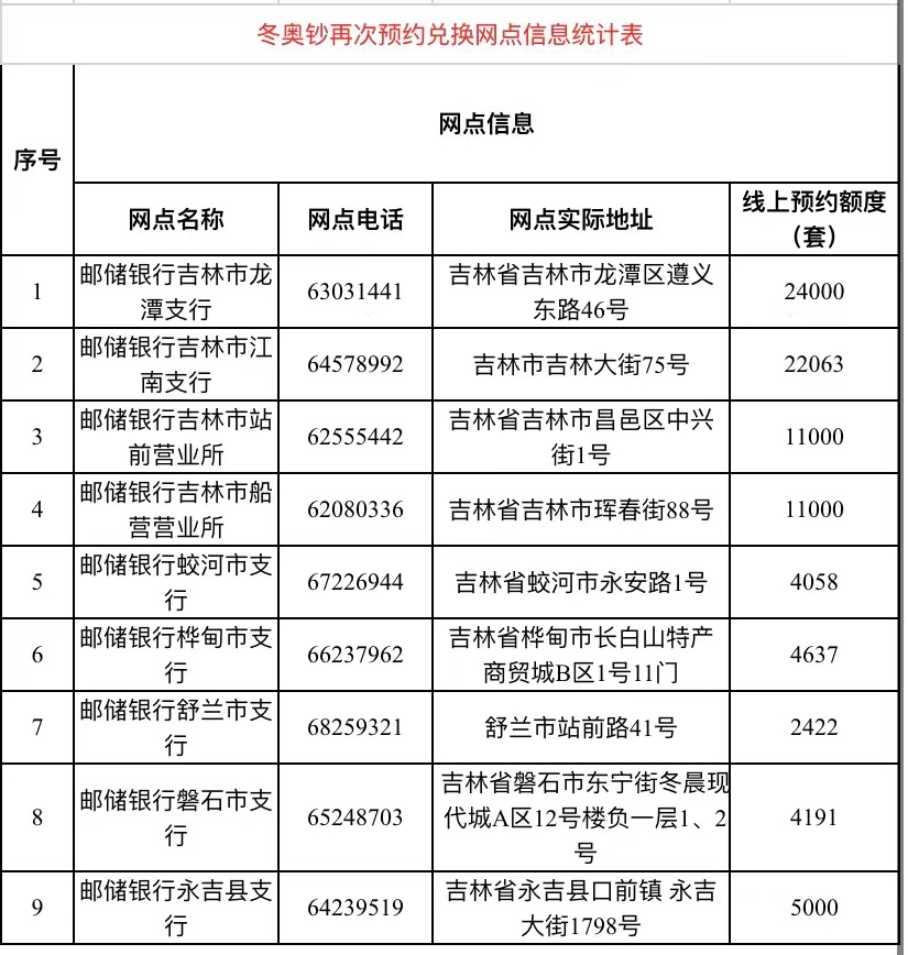 中國郵政儲蓄銀行吉林市分行承辦冬奧幣、冬奧鈔再次預約兌換的地區為:吉林、蛟河、樺甸、舒蘭、磐石、永吉(市、縣)的部分地區。其中:預約兌換網點共9個,其他網點不提供預約兌換服務(具體預約兌換網點及分配額度附后)。
