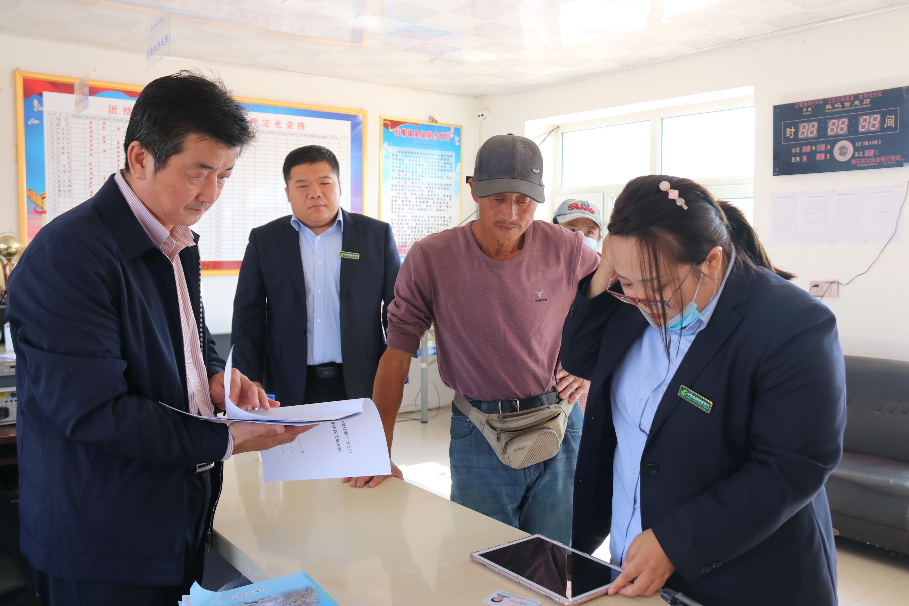 十一前夕,磐石市石咀鎮團結村,黃綠相間的玉米田和稻田在藍天的映襯下,勾勒出一幅豐收在望的喜人畫卷,秋風吹過,帶來陣陣豐收氣息。團結村村部,郵儲銀行磐石市支行信貸人員正在有序忙碌著,利用移動展業設備現場為老百姓辦理業務。