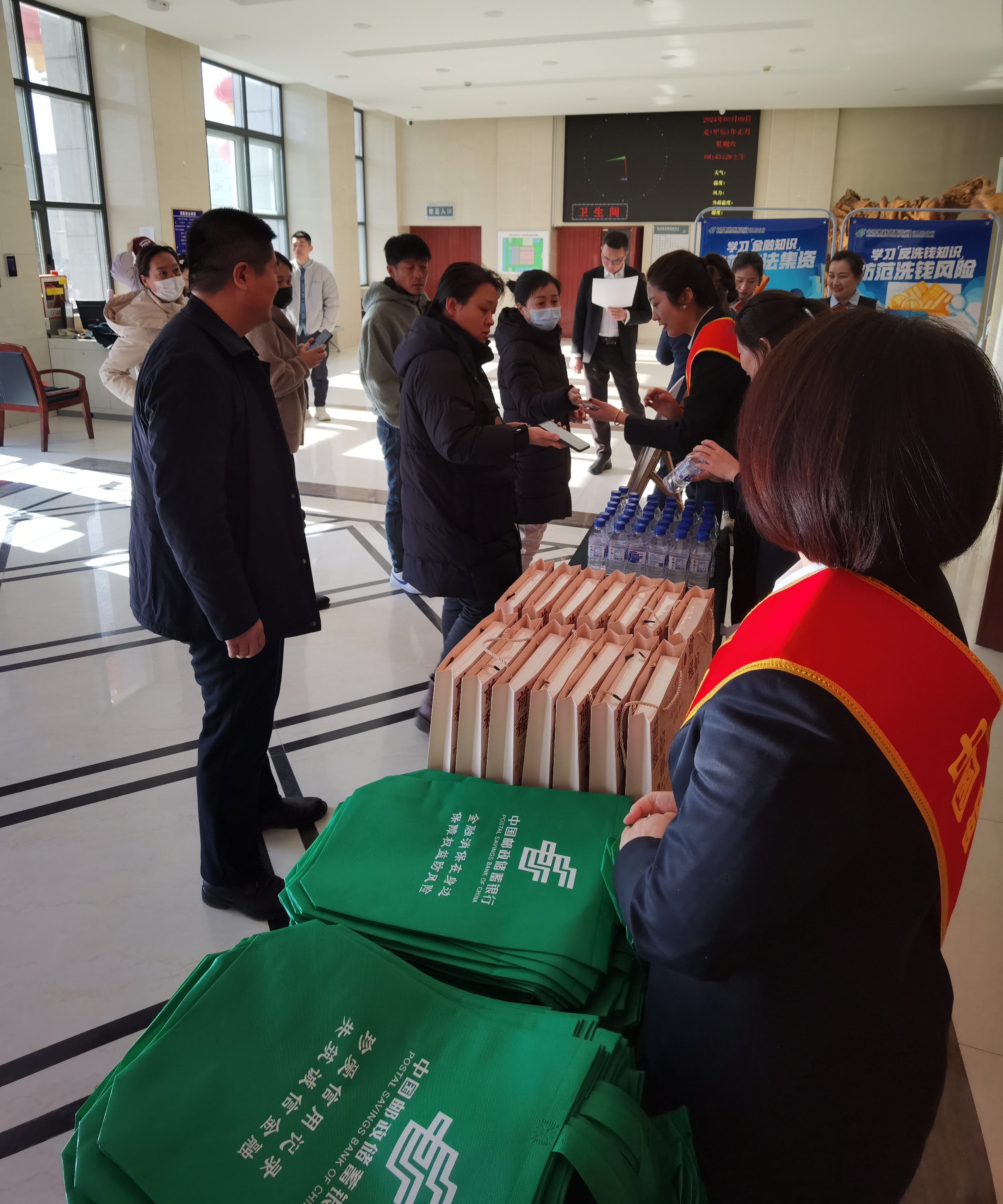 活動當日,會場外布置了金融知識宣傳活動專區,擺放反洗錢及防范非法集資宣傳展架,普及金融知識,幫助消費者正確認識金融產品和服務,提高識別防范非法金融活動的能力;擺放H5二維碼展板,引導消費者掃碼金融消費者八項基本權利,了解自身合法權益,增強維權意識;擺放金融知識幸運大轉盤,吸引消費者積極參與,設置了參與獎及幸運獎,參與獎為印制帶有“金融消保在身邊,保障權益防風險”的無紡布兜,幸運獎為帶有“前程似錦,金榜題名”的筆記本禮盒,提高教育宣傳活動的新穎性、趣味性、互動性。 進入會場后,多媒體主屏幕循環播放宣傳視頻,兩側屏幕播放宣傳口號,會場張貼宣傳條幅,主持人現場講解金融知識、金融服務政策,現場與消費者互動交流、答疑解惑,積極營造“學金融、懂金融、信金融、用金融”良好氛圍。