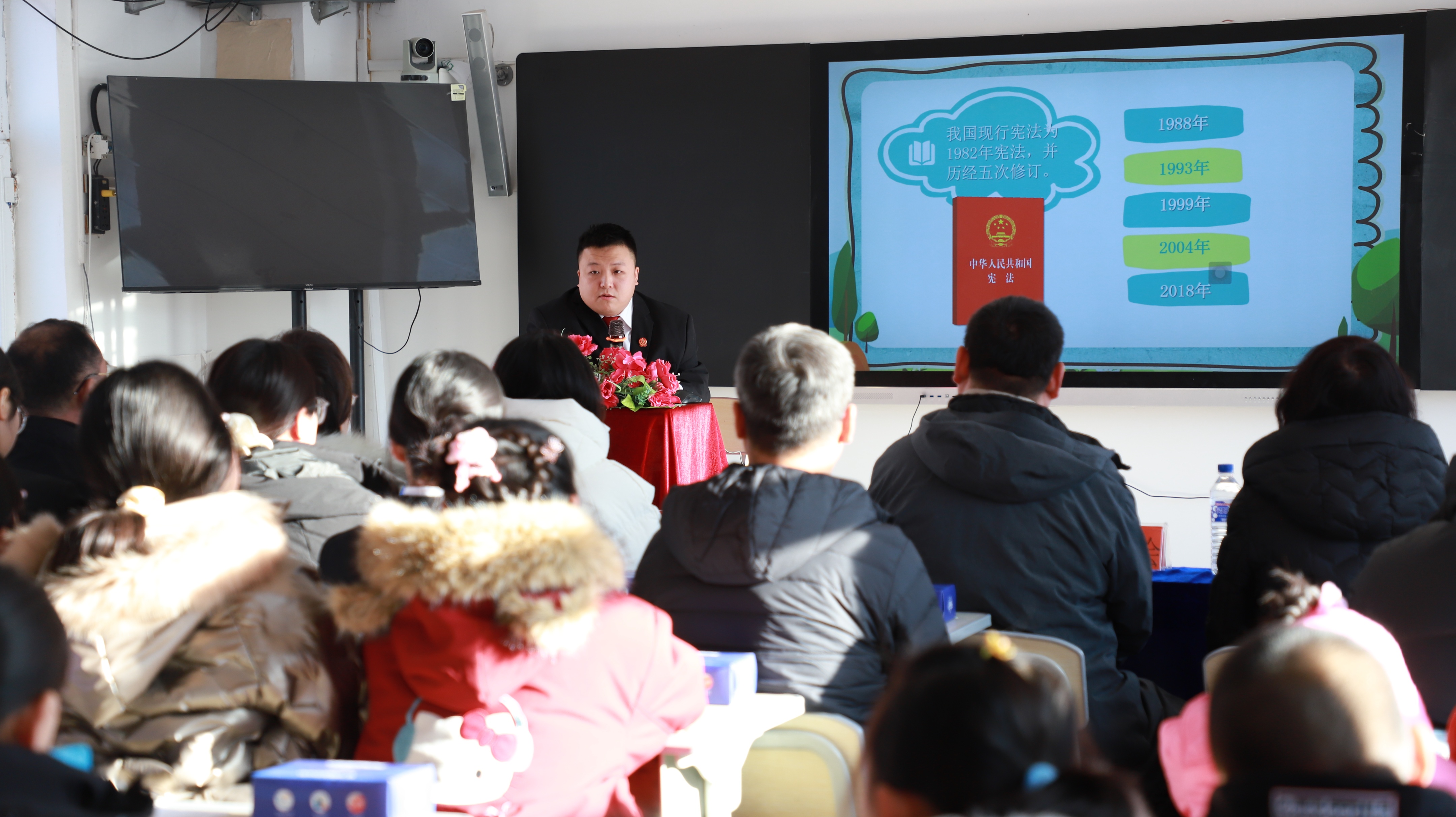 “同學們,你們知道憲法是什么嗎?我國的憲法日是哪一天?” 民事審判第一庭法官、太平川鎮第三小學法治副校長單寶成用兩個問題點燃了同學們的參與熱情,課堂上,沒有枯燥的法條背誦,取而代之的是“受教育權如何保護我們上學”“人格尊嚴權為何不能給同學起綽號”等貼近校園生活的話題,讓原本嚴肅的法律條文在趣味解讀中變得鮮活可感,贏得了同學們的陣陣掌聲。