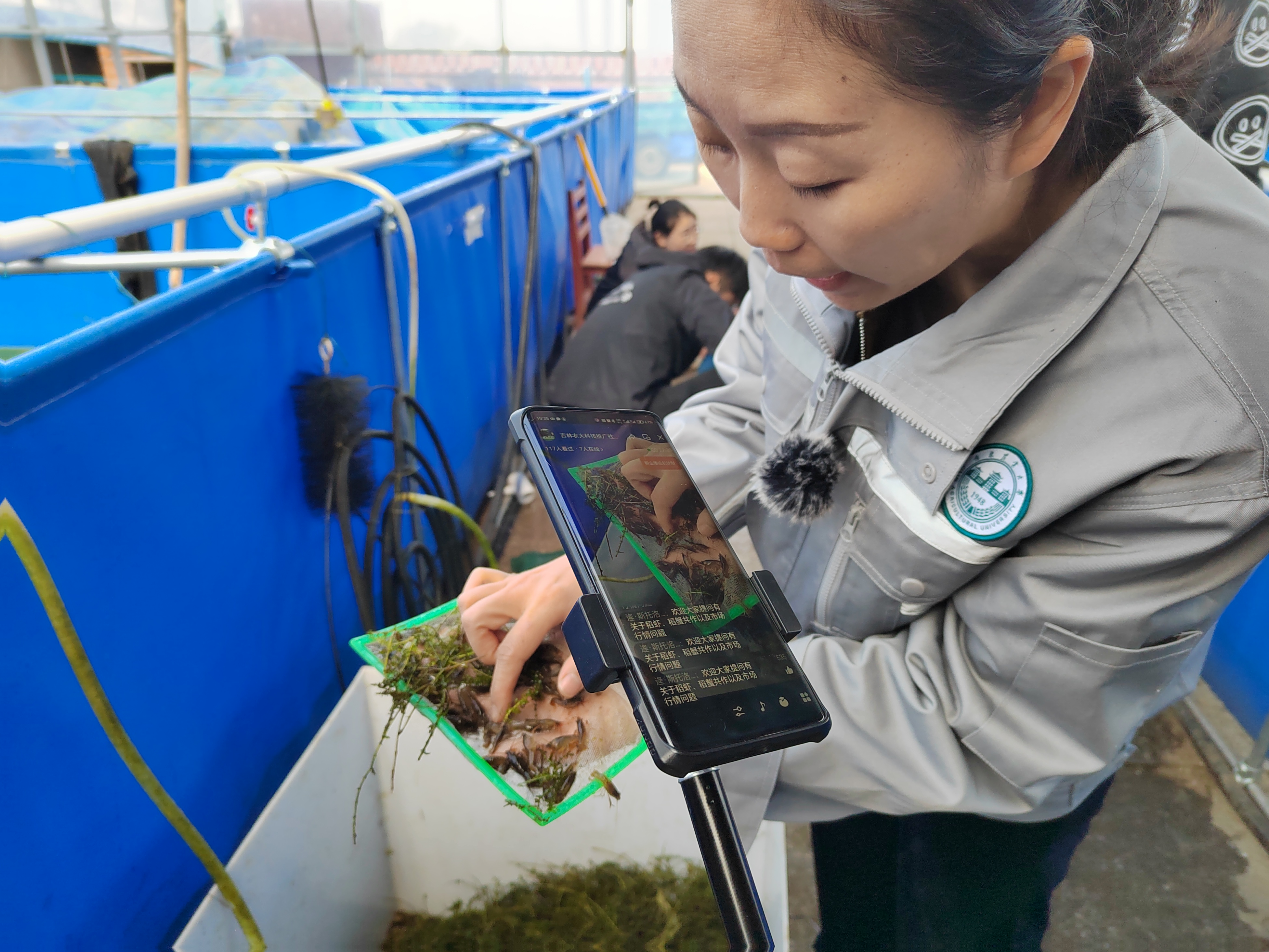 5月11日,在公主嶺市南崴子街道南崴子村,公主嶺稻漁科技小院小龍蝦種苗繁育基地負責人王秋舉通過網絡直播課堂,向農民朋友詳細地介紹稻田如何養殖小龍蝦及其帶來的效益。