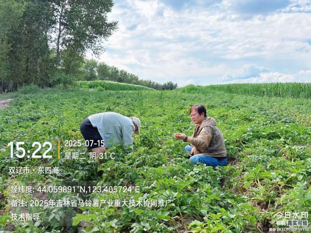 為更好地推動吉林省農業重大技術協同推廣項目-馬鈴薯膜下滴灌水肥一體化高效生產技術示范推廣的順利實施,7月15-16日,項目組成員前往雙遼市那木鄉、茂林鎮,長嶺縣三青山鎮開展示范基地田間病害調查及技術指導。 由于近期高溫天氣及當地降雨量持續偏少,雙遼市那木鄉井崗村、茂林鎮孟益村的部分地塊出現了不同程度的旱情,馬鈴薯植株出現葉片枯黃、打綹、生長緩慢等現象,項目組成員指導示范戶開展抗旱保產,及時采取補救措施,確保馬鈴薯正常生長。