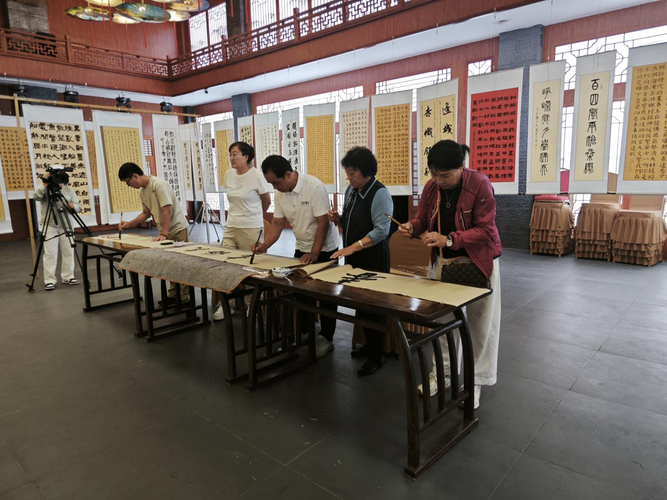 傳統游戲區同樣人氣爆棚。作為朝鮮族傳統民俗游戲的擲柶,充滿趣味性與技巧性,玩家投擲柶木決定勝負時,每一次動作都伴隨著緊張氣氛與觀眾的吶喊助威,人們在歡樂中,深刻體會到朝鮮族傳統文化的深厚底蘊。在非遺技藝展覽區里,傳統剪紙、石雕、木瓢畫等作品琳瑯滿目。非遺傳承人現場演示制作過程,讓老祖宗的“隱藏技能”生動展現,不少人化身為非遺“追光者”,近距離感受非遺文化的深厚底蘊,仿佛穿越時空與歷史展開親密對話。民俗活動還設置了諸多驚喜環節,為這場民俗盛宴增添了更多色彩。普法宣傳展位前人頭攢動,工作人員熱情普及法律知識并派發神秘小禮物,讓人們在輕松氛圍中學習法律;“衙府的日常故事”互動環節備受歡迎,游客化身斷案“小能手”,在參與有趣案件的過程中,增強了法律意識。 “筆墨書初心·共建促發展”書法展活動,以藝術詮釋長白人文精神。書法展也是本次民俗節的一大亮點,來自全縣各界優秀書法家們聚焦交通強國與傳統文化精心創作屬于自己的書法作品。一幅幅作品高高懸掛,將展廳墻壁變成了藝術墻,吸引了很多市民游客前來打卡拍照。來自沈陽的游客張女士來到展廳漫步欣賞完書法作品后說:“沒想到會在景區里看到這么優秀的書法作品,在民俗文化旅游節上設置書法展我覺得十分有新意,這能夠讓我們現場感受筆墨之美與文化傳承。”