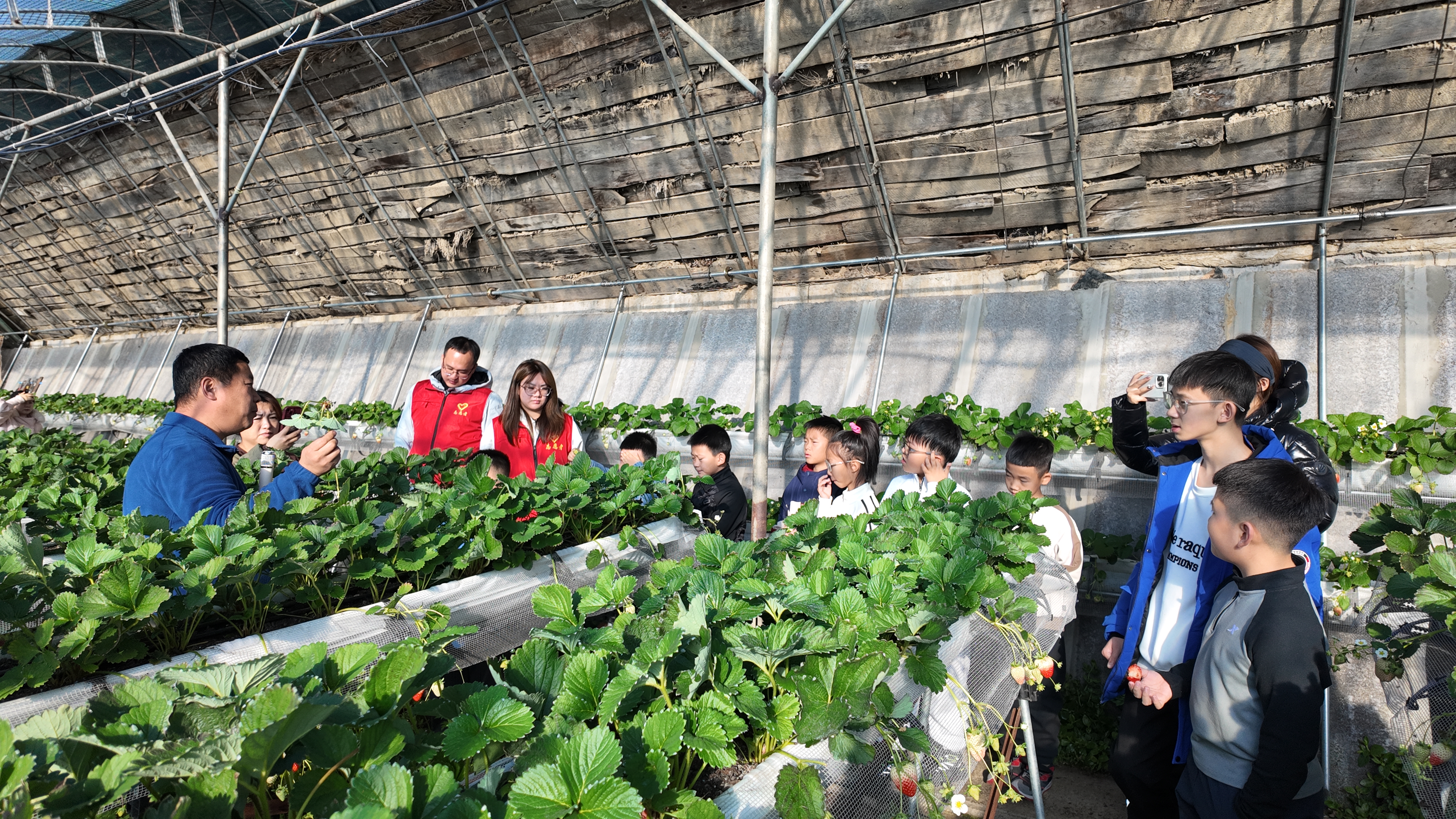 在溫暖如春的溫室大棚內(nèi),負(fù)責(zé)人馬亮向?qū)W生們講解了溫室草莓的種植技術(shù)與科學(xué)管理要點,并結(jié)合棚膜結(jié)構(gòu)、溫控系統(tǒng)等內(nèi)容,生動闡釋了現(xiàn)代農(nóng)業(yè)技術(shù)的應(yīng)用原理。孩子們認(rèn)真聆聽,積極提問,對“冬天里的草莓園”充滿了好奇。隨后,學(xué)生們在工作人員指導(dǎo)下親身參與草莓采摘勞作,學(xué)習(xí)農(nóng)事操作技巧,在體驗采摘樂趣的同時,深刻體會到勞動的艱辛與收獲的喜悅。