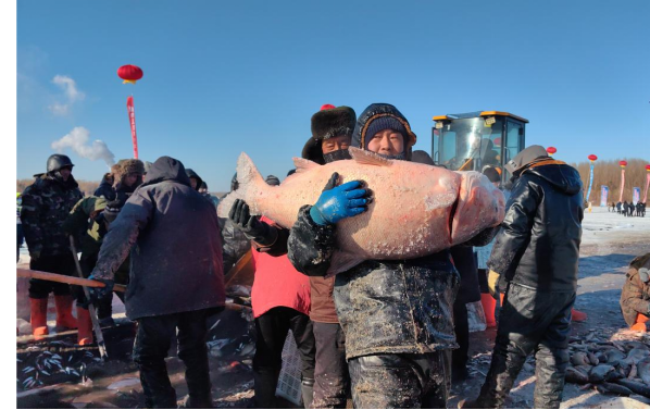 為了讓游客們更好地體驗漁獵文化,現場實現了捕撈、銷售、郵寄一站式服務。剛捕撈上來的鮮魚,還帶著江水的冰寒與鮮美的氣息,游客們可以現場挑選、稱重、付款,工作人員會迅速進行打包、保鮮處理,并提供郵寄服務,讓這份來自嫩江的鮮美能夠快速送達全國各地。“捕撈觀賞-現場采購-全國速遞”的消費閉環,不僅讓游客們品嘗到了最新鮮的江魚,更讓大安的漁產品走出了吉林,走向了全國。此外,現場還設置了玉龍湖冬捕豐收惠民抽獎活動,市民們踴躍參與,不少人幸運地免費獲得了冬捕鮮魚,臉上洋溢著喜悅的笑容。