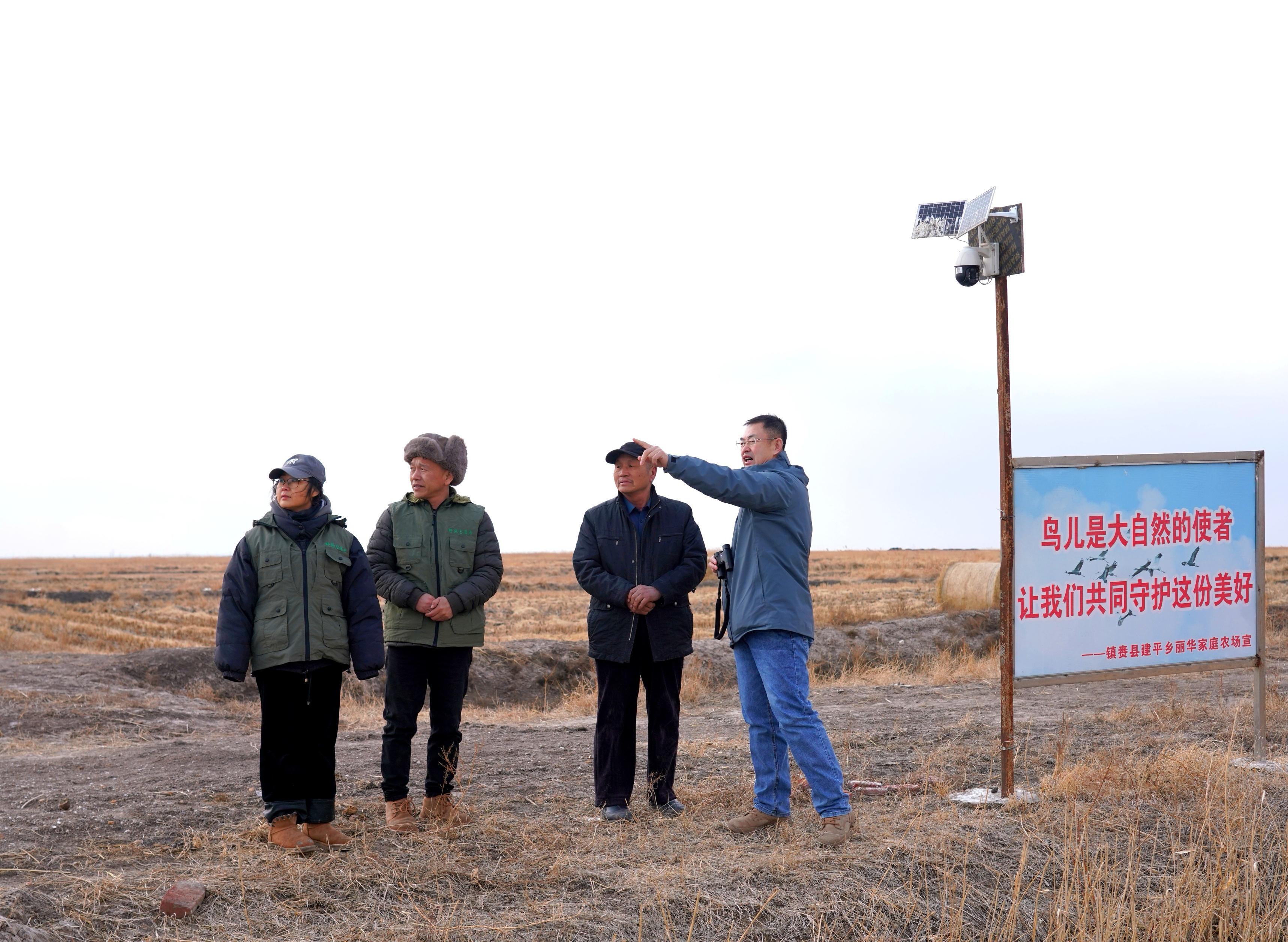 “護飛”志愿者毛旭、張利發現鳥群后迅速聯動護飛隊和相關部門,并表示“我們要在候鳥活動區域增加攝像頭和警示標牌,保障這些珍貴的鳥兒不受干擾。” 生態優先:濕地修復托起“候鳥天堂” 鎮賚縣地處東亞-澳大利西亞候鳥遷徙通道的核心區,被中國野生動物保護協會授予“中國白鶴之鄉”稱號。全球約90%的白鶴種群每年在此停歇補給,高峰期單日觀測記錄逾4000只。鎮賚縣踐行“生態優先、農業強基、能源興業”發展戰略,實施退耕還濕、河湖連通等工程,近年來累計修復濕地70.3萬畝,形成連片水域和淺灘沼澤,濕地生態系統服務功能顯著提升。同步推廣的生態農業模式,在秋收后保留玉米、稻田殘茬作為“候鳥食堂”,實現“農田變食堂”的生態奇觀。生態志愿者姜海濤:"對比2014年濕地修復前的2300只記錄,白鶴數量十年增長到6900只,印證生態治理成效"。 科學守護:人與鶴的千年之約 鶴類種群的如期回歸,為白鶴大部隊的到來奏響序曲。作為對棲息環境極為敏感的“生態質檢員”,白鶴、灰鶴種群連續十年穩定棲息印證了鎮賚生態系統的健康度。當地構建“天地空”一體化監測網絡,依托莫莫格保護區6個保護站、各鄉鎮生態護林員和科研機構衛星追蹤數據,精準掌握候鳥遷徙規律。護飛志愿者團隊負責人表示:“我們已對重點區域開展棲息地優化,白鶴偏愛的淺水覓食區、夜棲安全島均完成環境評估,確保‘主角’登場時能享受‘貴賓禮遇’。”