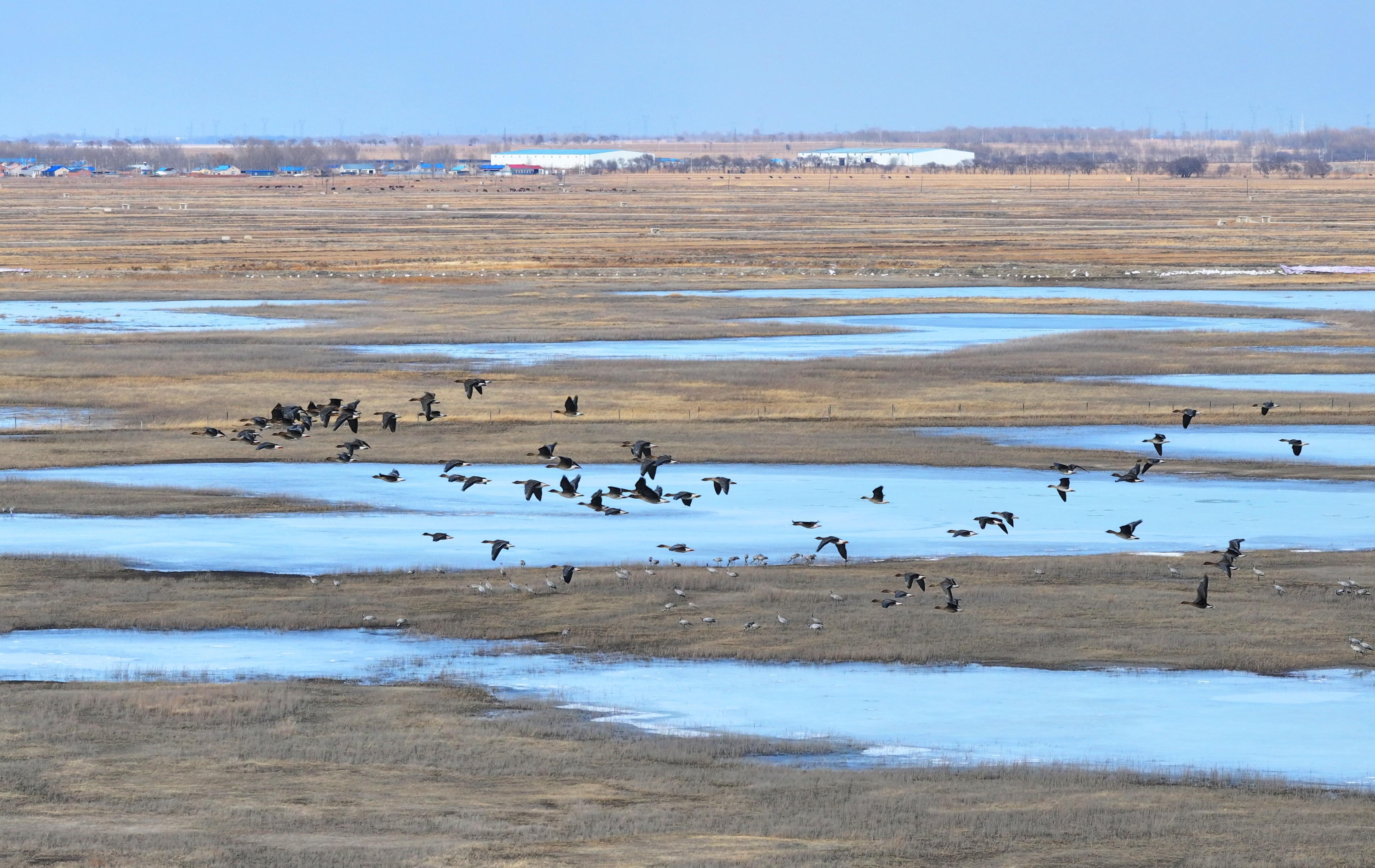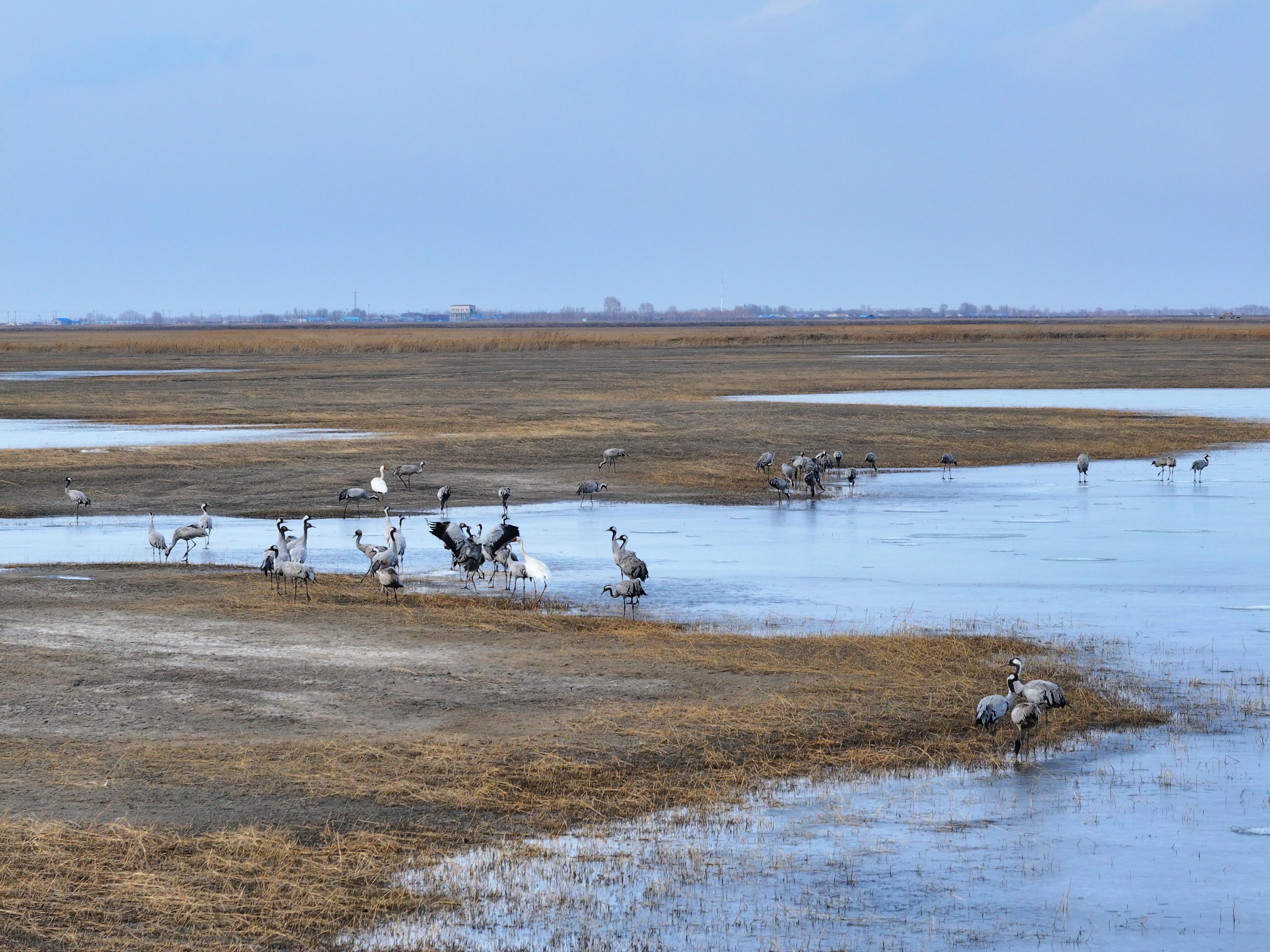 觀鳥勝地:綠水青山間的世界窗口 依托“一江三河”及吉林莫莫格國家級自然保護區,鎮賚縣打造出集生態保護、科研教育、文旅體驗于一體的“觀鳥勝地”。在延伸進蘆葦蕩的觀鳥棧道、全景式濕地科普館及多個候鳥觀測點,讓游客可在不驚擾鳥類的情況下,近距離觀賞白鶴“雪衣翩躚舞晴空”的震撼場景。據統計,2024年鎮賚接待觀鳥游客超2.4萬人次,帶動服務業、濕地周邊村民創收,真正實現“一群鶴養活一方人”。國內著名生態攝影專家贊嘆:“這里不僅是白鶴的生存命脈,更是向世界展示中國生態文明的金色名片。” 當第一縷春光融化冰層,鎮賚的蘆葦濕地便成了候鳥的超級會客廳,吉林莫莫格國家級自然保護區管理局科研科負責人王波:保護區內多只東方白鸛已經回來修整鳥巢,蒼鷺、雁、鴨等也現身濕地,我們的遷徙水鳥監測工作已經全面啟動。