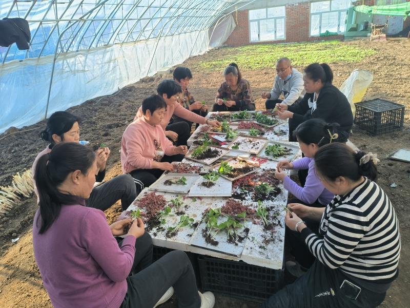 沿著村路一直向前,走進望江村育苗大棚,映入眼簾的是一派熱鬧非凡的生產景象,農戶幾人一組圍坐在一起,有的負責菜苗嫁接,有的負責填土裝盤,有的負責擺放營養缽,大家分工有序、手腳麻利地進行著冬季育苗作業。